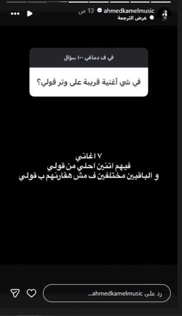 ورد «كامل» على أحد متابعيه عبر حسابه الرسمي بموقع إنستجرام، الذي سأله: «فيه أغنية قريبة على وتر (قولي)؟»، ليجيب قائلاً: