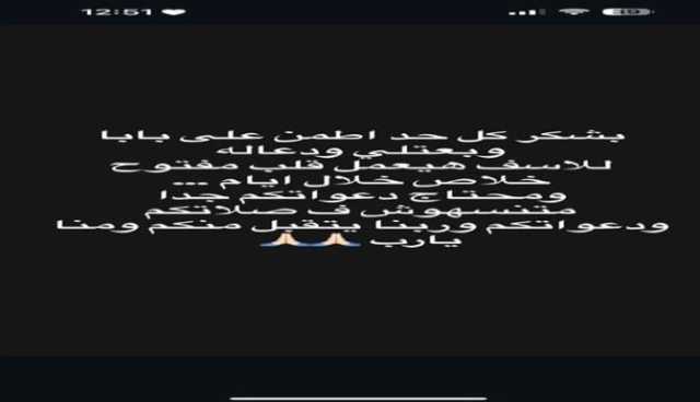 وكانت بتول الحداد، أثارت عبر حسابها الرسمي بموقع تداول الصور والفيديوهات «إنستجرام» حالة من القلق على والدها، قائلة: «بابا في العناية المركزة وأنا للأسف مش جنبه، فضلًا ادعوله يقوم بالسلامة ويخف ويخليه ليا، ادعوا له والنبي دا روح قلبي».