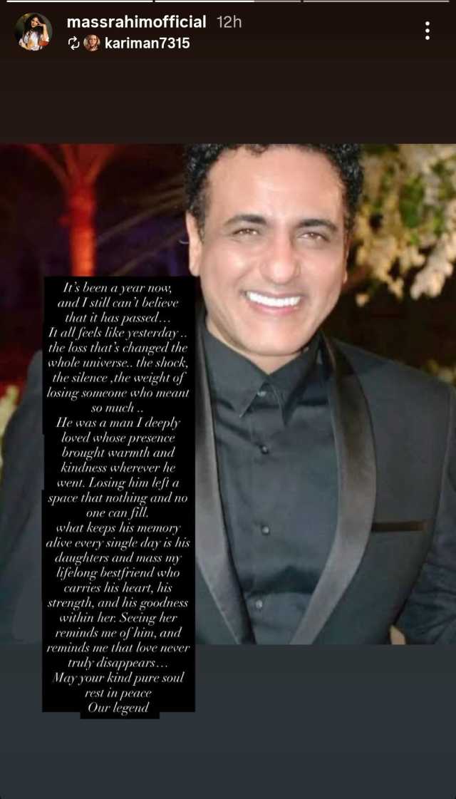ونشرت ماس محمد رحيم، صورة والدها عبر ستوري انستجرام، وكتبت: «لقد مر عام الآن، وما زلت لا أصدق أنه مر… كل شيء يبدو وكأنه بالأمس... الخسارة التي غيرت الكون بأكمله... الصدمة، الصمت، وطأة فقدان شخص كان يعني لي الكثير… كان رجلاً أحببته بعمق، وكان وجوده يجلب الدفء واللطف أينما ذهب. ترك فقدانه مساحة لا يمكن لأحد أو شيء أن يملأها».