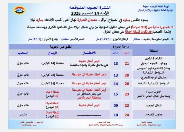 قالت الهيئة العامة للأرصاد الجوية، إن غدًا الأحد، يسود طقس بارد في الصباح الباكر، ومعتدل الحرارة نهارا على أغلب الأنحاء بارد ليلا.