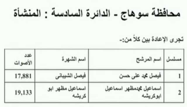 وأعلن رئيس الهيئة الإعادة بين مرشحين اثنين بالدائرة السادسة المنشأة بسوهاج هما: فيصل محمد – إسماعيل محمد.