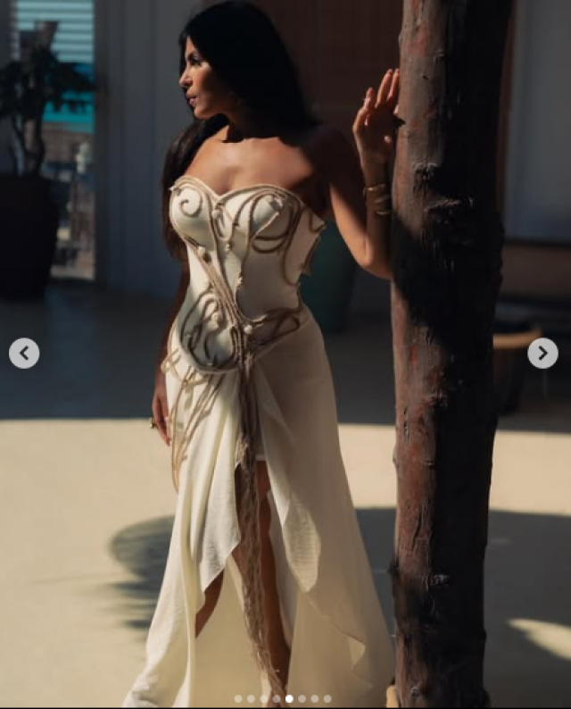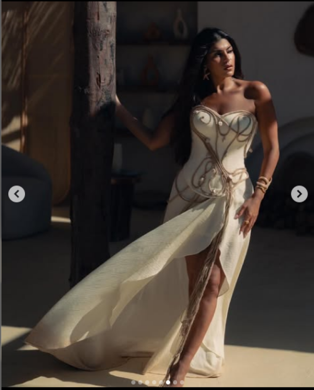 تألقت زوجة ماجد المصري في الصور بإطلالة ملفتة من توقيعها، حيث ارتدت فستان طويل من الخلف و قصير من الأمام واتسم التصميم باللون الأبيض المزين ببعض النقوشات التي كانت بـ اللون البيج.