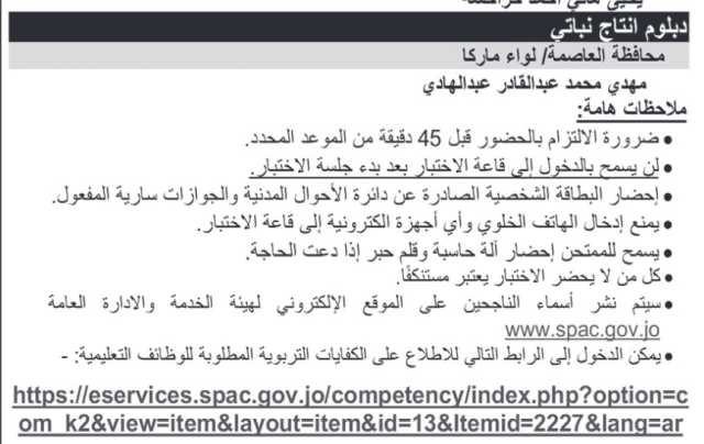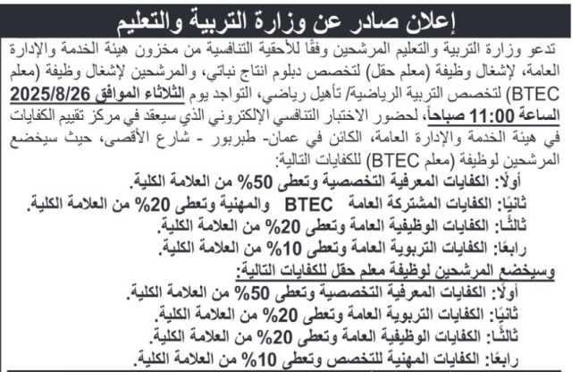 دعت #وزارة_التربية والتعليم، مرشحين لحضور #الاختبار_التنافسي لاشغال #وظيفة_معلم.