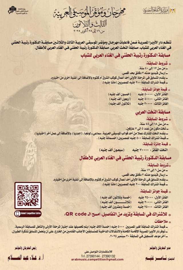 برعاية وزارة الثقافة، قامت دار الأوبرا المصرية برئاسة الدكتور علاء عبد السلام بفتح باب التسجيل للراغبين في الاشتراك بالمسابقة المصاحبة لفعاليات مهرجان ومؤتمر الموسيقى العربية 33 والذى يديره المايسترو تامر غنيم ويقام فى الفترة من 16 إلى 25 أكتوبر المقبل .