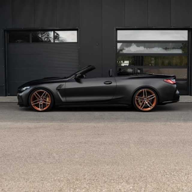 الواجهة الأمامية لسيارة BMW M4 المعدلة تأتي بمصابيح حادة الشكل، ولمسات خارجية من ألياف الكربون، مع طلاء أسود مط، ومقصورة داخلية من الجلد الأسود للمقاعد، وللأرضيات أيضًا، مع لمسات من الكربون فاير من الداخل.