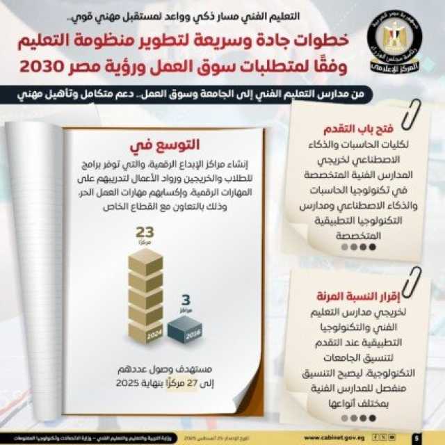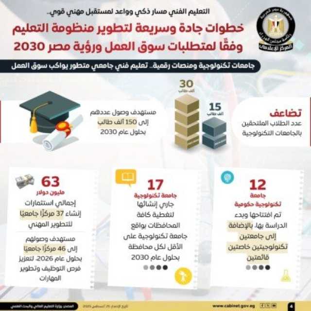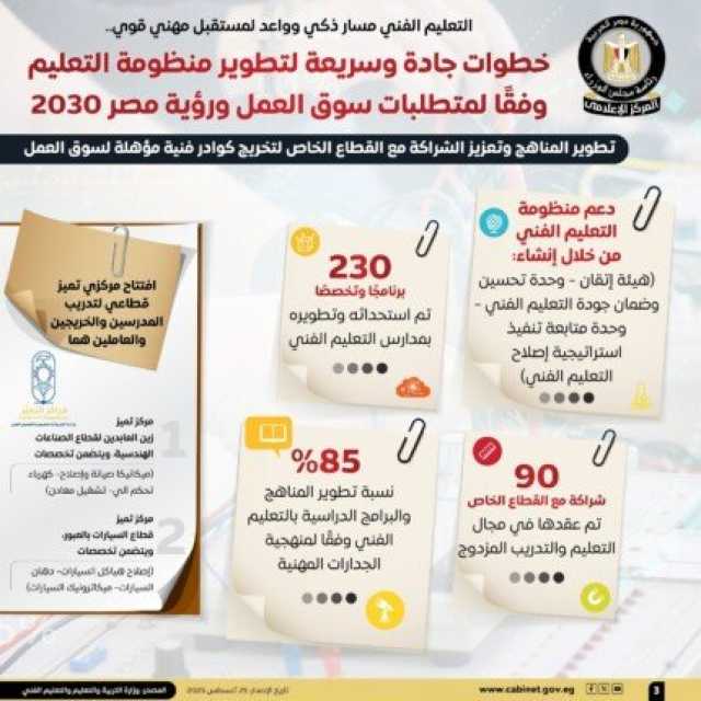 نشر المركز الإعلامي لمجلس الوزراء عددًا من الإنفوجرافات عبر منصاته على مواقع التواصل الاجتماعي، استعرض من خلالها الخطوات الجادة والسريعة لتطوير منظومة التعليم الفني وفقًا لمتطلبات سوق العمل ورؤية مصر 2030، باعتباره مسار ذكي وواعد لمستقبل مهني قوي.