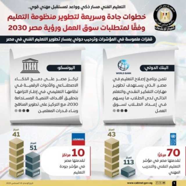 واستعرضت الإنفوجرافات القفزات الملموسة في المؤشرات والترحيب الدولي بمسار تطوير التعليم الفني في مصر، حيث ثمن البنك الدولي برنامج إصلاح التعليم في مصر، الذي يستهدف تطوير مهارات التفكير النقدي والتعلم الذاتي لدى الطلاب، ما يسهم في إعداد الطلاب لسوق العمل.
