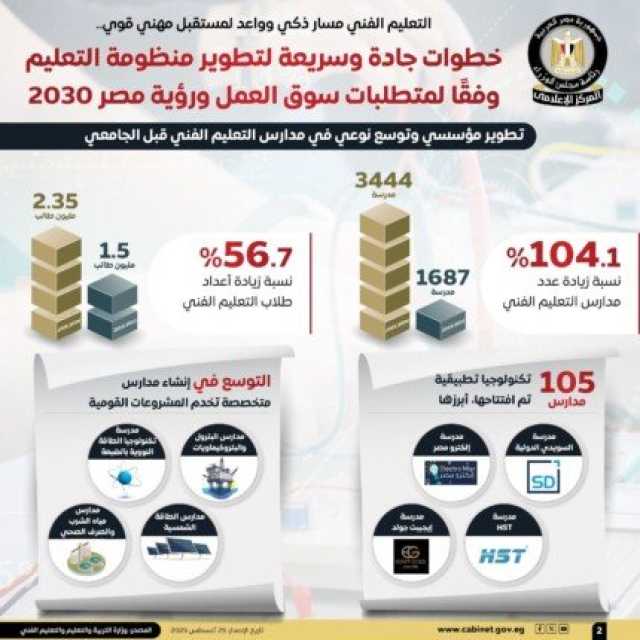 وفيما يتعلق بالتطوير المؤسسي والتوسع النوعي في مدارس التعليم الفني، أظهرت الإنفوجرافات زيادة عدد مدارس التعليم الفني بنسبة 104.1%، لتصل إلى 3444 مدرسة عام 2024/2025، مقابل 1687 مدرسة عام 2013/2014، فضلًا عن زيادة أعداد طلاب التعليم الفني بنسبة 56.7%، لتصل إلى 2.35 مليون طالب عام 2024/2025، مقابل 1.5 مليون طالب عام 2013/2014.