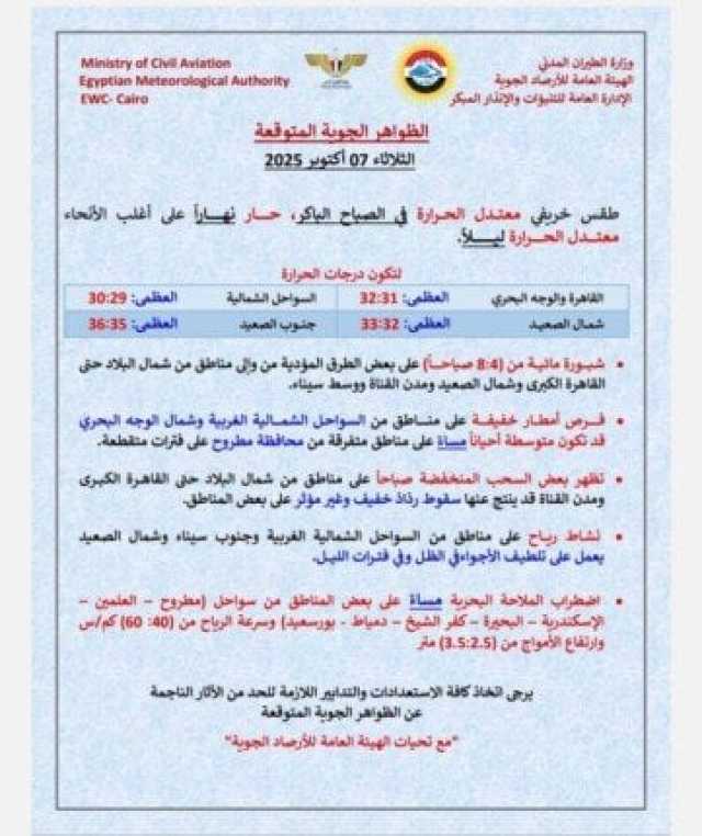 كشفت الهيئة العامة للأرصاد الجوية عن تفاصيل حالة الطقس المتوقعة اليوم الثلاثاء 7 أكتوبر 2025، موضحة أن البلاد تشهد طقسًا خريفيًا معتدل الحرارة في الصباح الباكر، وحارًا نهارًا على أغلب الأنحاء، ومعتدلًا ليلًا.