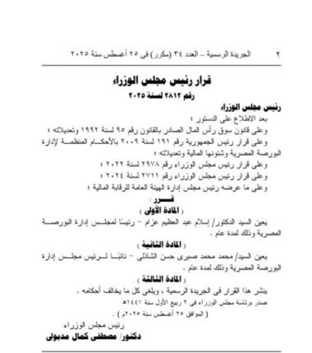 أصدر الدكتور مصطفى مدبولي، رئيس مجلس الوزراء، القرار رقم 2812 لسنة 2025 بتعيين الدكتور إسلام عبد العظيم عزام، رئيساً لمجلس إدارة البورصة المصرية لمدة عام.