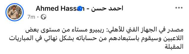 وكتب أحمد حسن نقلًا عن مصدر في الجهاز الفني للنادي الأهلي، على حسابه الشخصي بموقع فيسبوك: "ريبيرو مستاء من مستوى بعض اللاعبين وسيقوم باستبعادهم من حساباته بشكل نهائي في المباريات المقبلة ".