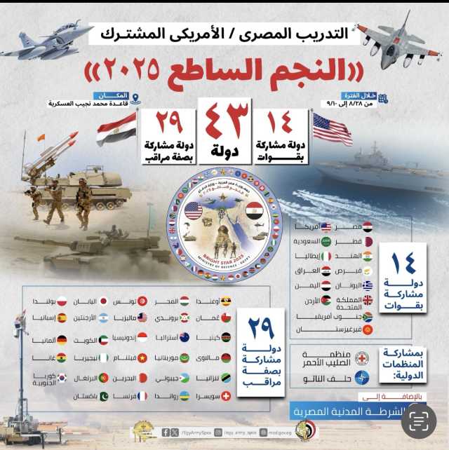 النجم الساطع 2025وأوضحت القوات المسلحة أن 43 دولة سوف تشارك في تدريب “النجم الساطع 2025”، منها 14 دولة بصفة "مشارك" بأكثر من 8000 مقاتل، بالإضافة إلى 29 دولة بصفة "مراقب".