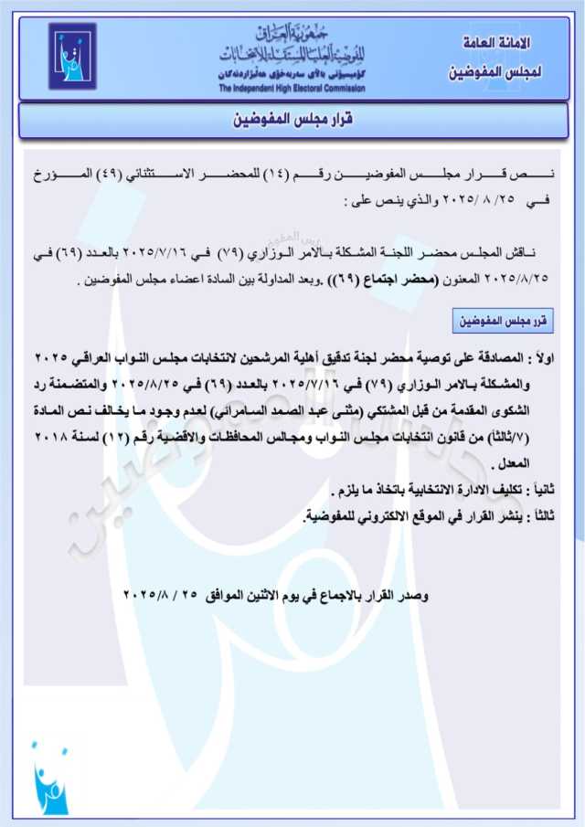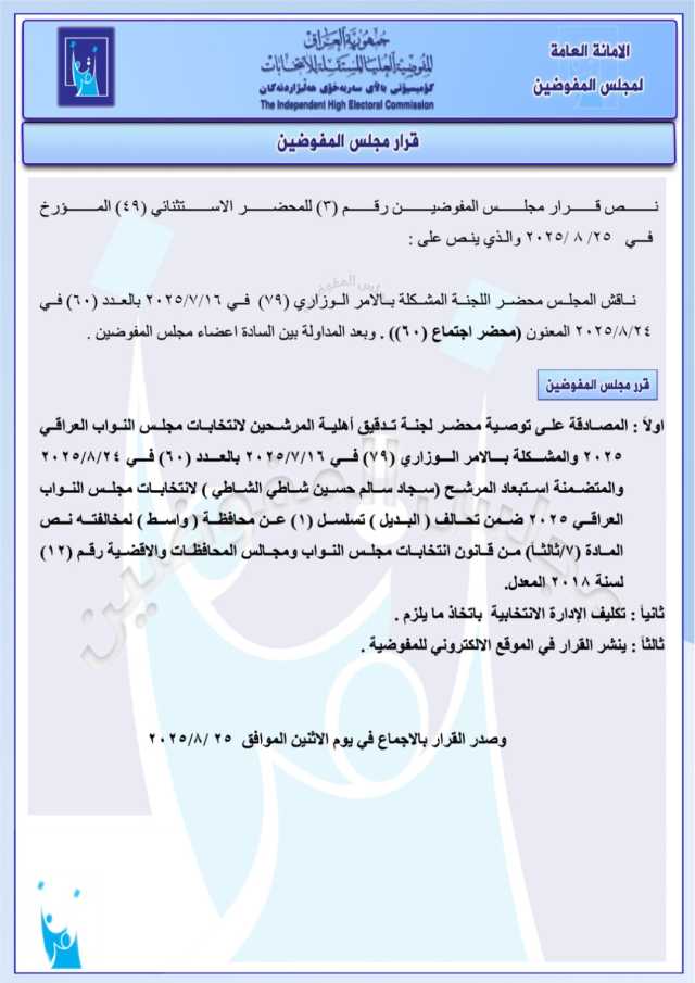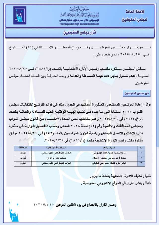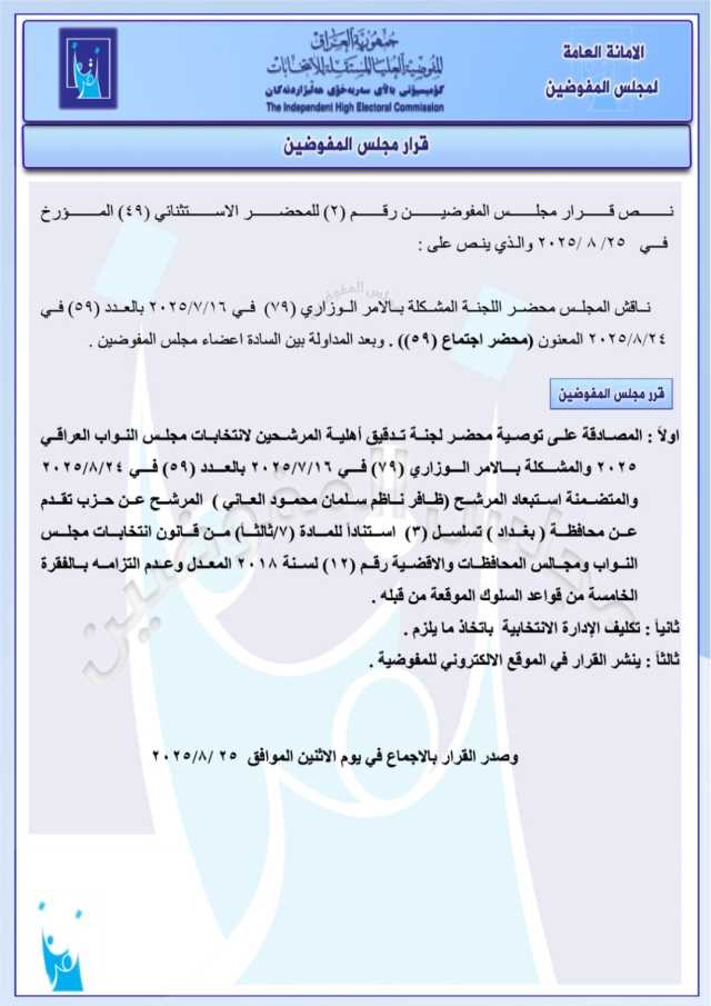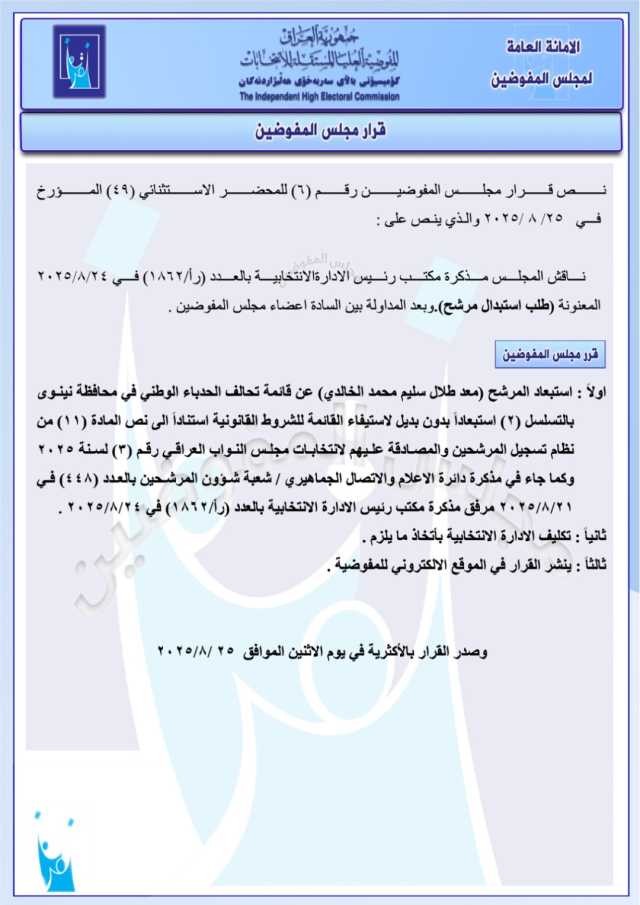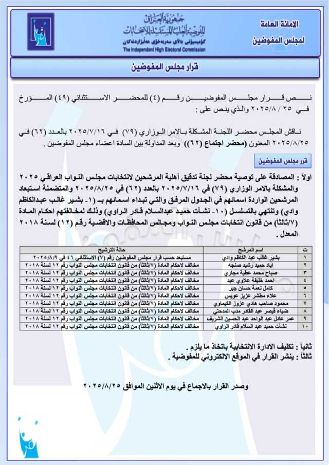 آخر تحديث: 26 غشت 2025 - 11:14 ص بغداد/ شبكة أخبار العراق- أعلنت المفوضية العليا المستقلة للانتخابات في العراق، اليوم، إعادة مرشحين مستبعدين إلى السباق الانتخابي فيما استبعدت آخرين لمخالفتهم قانون الانتخابات.وأشارت المفوضية في وثائق نشرت من قبلها، إلى أن قرار إعادة المرشحين بعد استبعادهم جاء “لعدم كفاية الأدلة الثبوتية”.
