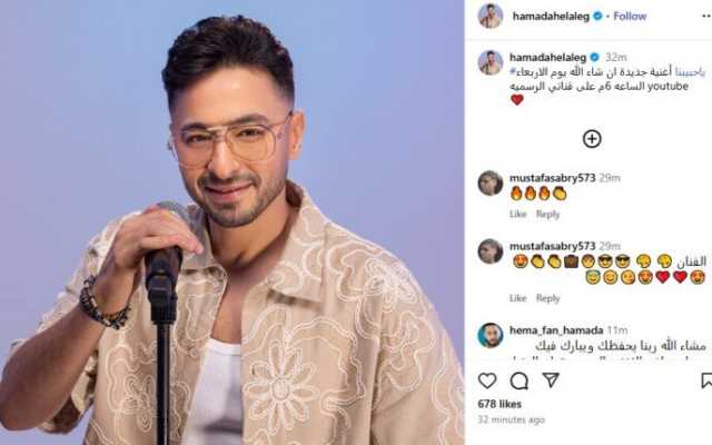 أعلن الفنان حمادة هلال عن موعد طرح أحدث أغنياته التي تحمل عنوان يا حبيبنا، عبر حسابه الرسمي على موقع تبادل الصور والفيديوهات إنستجرام، وعلق قائلاً: «ياحبيبنا أغنية جديدة ان شاء الله يوم الاربعاء الساعة 6 مساء على قناتي الرسمية يوتيوب».