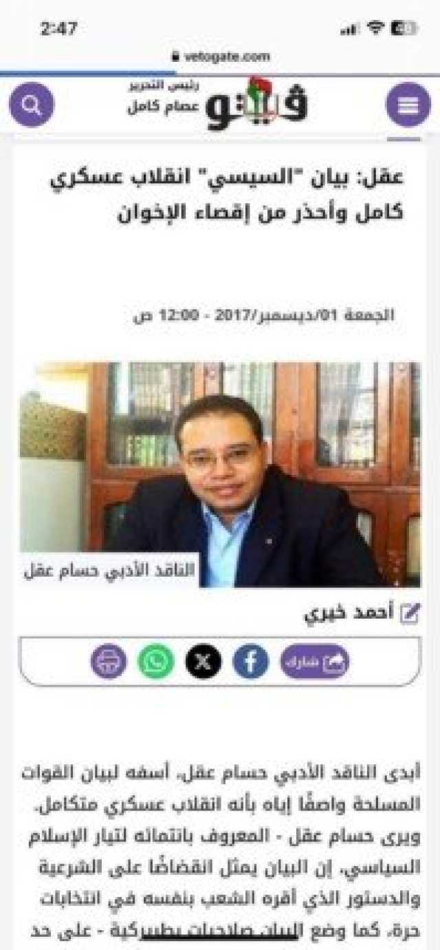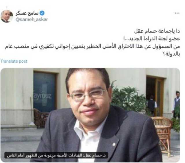 وشارك صاحب حساب باسم «سامح عسكر» على منصة إكس صورة «عقل» معلقًا: «دا ياجماعة حسام عقل عضو لجنة الدراما الجديد! من المسؤول عن هذا الاختراق الأمني الخطير بتعيين إخواني تكفيري في منصب عام بالدولة؟».