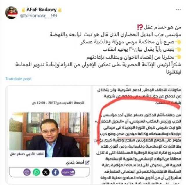 في حين استنكر صاحب حساب آخر يحمل اسم «ÀFaF Badawy» قرار التعيين، قائلًا: «من هو حسام عقل؟! مؤسس حزب البديل الحضاري الذي قال هو نبت لرابعة والنهضة.. صرح بأن محاكمة مرسي مهزلة وفاشية عسكر.. .يتبنى رأيًا يقول بيان 30 يونيو انقلاب.. يحذرنا من إقصاء الإخوان ويطالب بإعادتهم.. شكرًا لرئيس الإذاعة المصرية على تمكين الإخوان من الدراما وإعادة تدوير الجماعة».