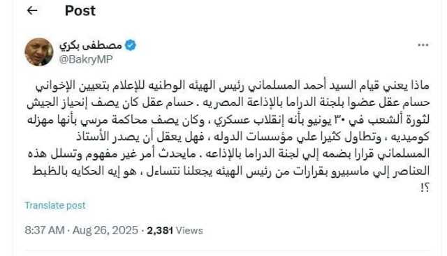 وتساءل «بكري» في منشور عبر حسابه على منصة إكس: «ماذا يعني قيام السيد أحمد المسلماني رئيس الهيئه الوطنيه للإعلام بتعيين الإخواني حسام عقل عضوا بلجنة الدراما بالإذاعة المصرية؟.. حسام عقل كان يصف انحياز الجيش لثورة ألشعب في 30 يونيو بأنه انقلاب عسكري، وكان يصف محاكمة مرسي بأنها مهزله كوميدية.. وتطاول كثيرا علي مؤسسات الدولة».