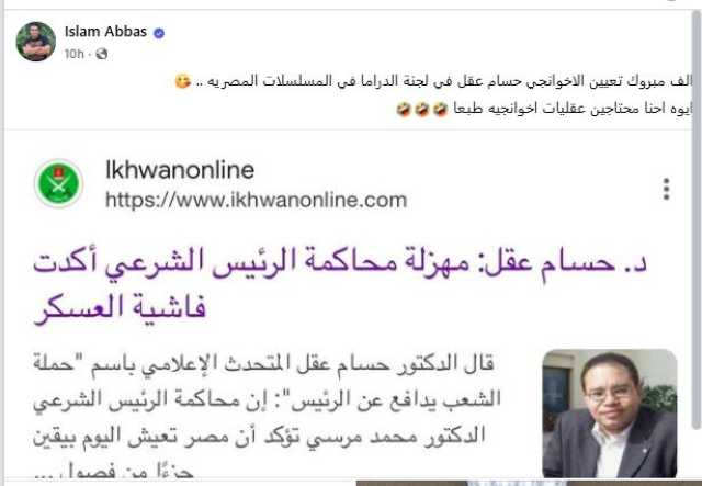وفي هذا السياق، علق حساب يحمل اسم « Islam Abbas»: «ألف مبروك تعيين الإخوانجي حسام عقل في لجنة الدراما في المسلسلات المصرية.. أيوه إحنا محتاجين عقليات إخوانجيه طبعا».