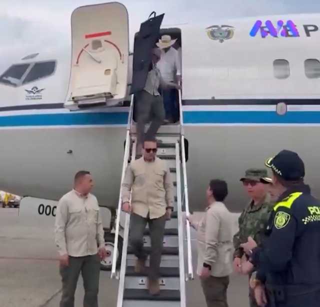وأظهرت اللقطات لحظة نزول بيترو من سلم الطائرة محاطًا بدرع واقٍ كبير أسود اللون صمم لحمايته من الرصاص، في إجراء أمني غير معتاد يعكس مستوى التهديدات التي تحيط بالرئيس الكولومبي.