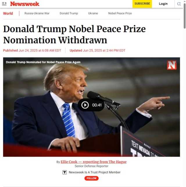 في موازاة ذلك، استندت حسابات موثقة على منصة "إكس" في الترويج لهذه المزاعم، إلى تقرير نُسب إلى مجلة نيوزويك الأميركية بعنوان: "انسحاب ترشيح دونالد ترامب لجائزة نوبل للسلام". غير أن صياغة العنوان والمحتوى في تلك المشاركات بدت مُحرفة عن الأصل، إذ جرى تداولها باعتبارها قرارًا من لجنة نوبل نفسها، في حين أن التقرير المشار إليه لم يرد فيه ما يؤكد صدور أي إعلان رسمي عن اللجنة بشأن شطب أو إلغاء ترشيح ترامب.