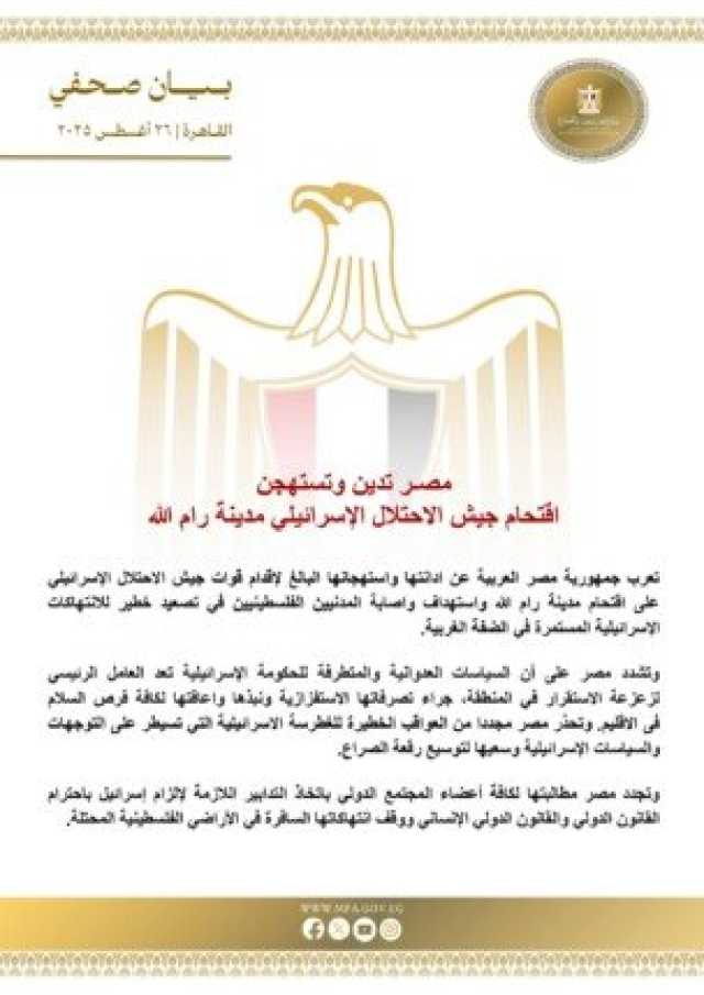 تعرب مصر عن إدانتها واستهجانها لخطوات قوات جيش الاحتلال الإسرائيلى على اقتحام مدينة رام الله، واستهداف وإصابة المدنيين الفلسطينيين فى تصعيد خطير للانتهاكات الإسرائيلية المستمرة فى الضفة الغربية.