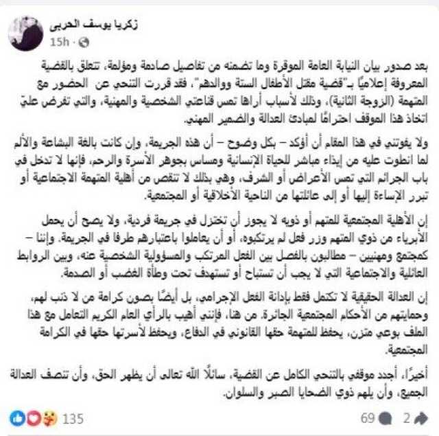أسباب التنحيأوضح المحامي في بيان نشره على صفحته الرسمية بموقع فيسبوك أن قراره جاء بعد أن اطلع على بيان النيابة العامة الذي تضمن تفاصيل صادمة ومؤلمة حول الواقعة.
