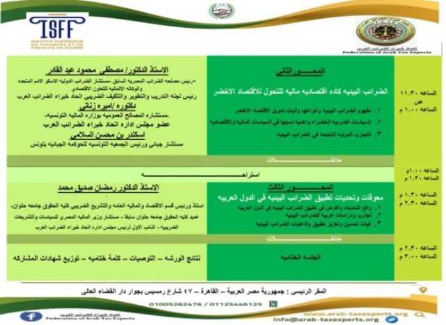 كما يتضمن البرنامج مداخلات علمية رفيعة المستوى، ونقاشات مفتوحة تساهم في إثراء الحوار حول السياسات الضريبية البيئية وآفاق تفعيلها في المنطقة العربية.