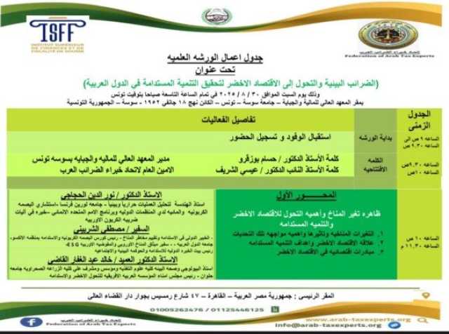 كلمات دلالية: الدول العربية تونس التنمية المستدامة الاقتصاد الأخضر ورشة علمية السياسات الضريبية اتحاد خبراء الضرائب العرب التعاون العربي