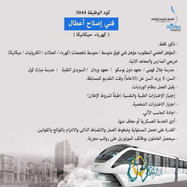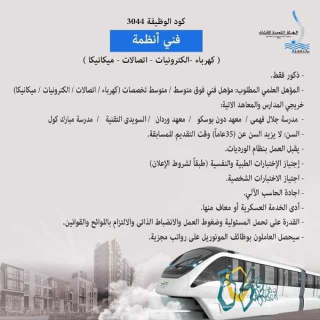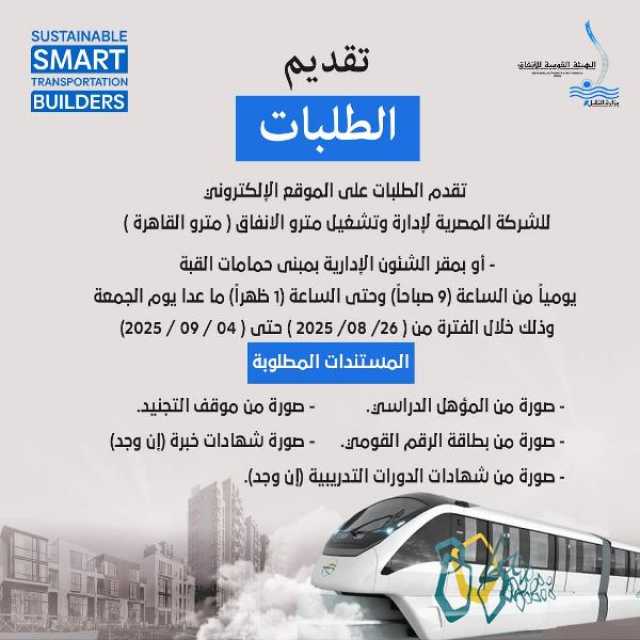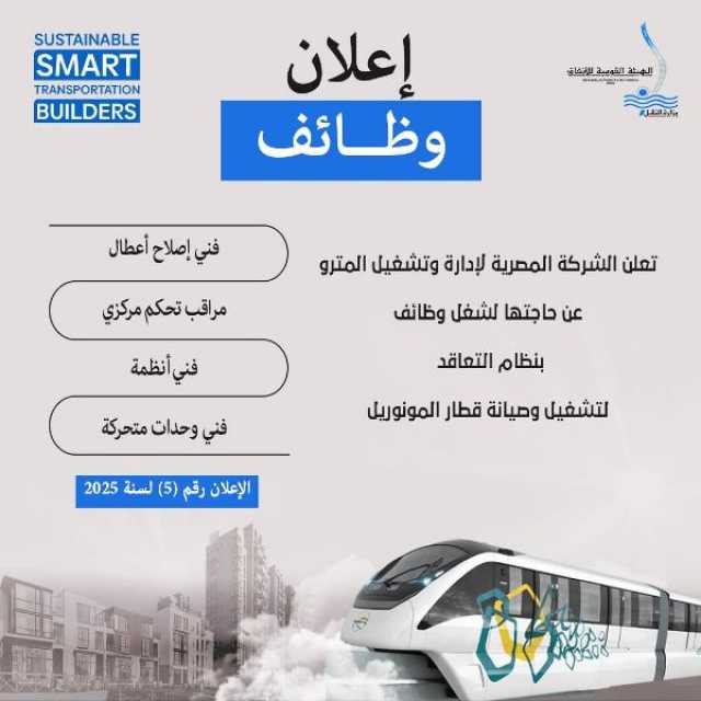 ويأتي هذا الإعلان في إطار خطة الدولة لزيادة فرص العمل للشباب داخل قطاع النقل الجماعي المتطور، إلى جانب المساهمة في تشغيل مشروع مونوريل شرق النيل، الذي يمثل خطوة استراتيجية مهمة نحو تعزيز البنية التحتية وتقديم خدمات نقل حديثة وآمنة تسهم في تحسين جودة الحياة للمواطنين.