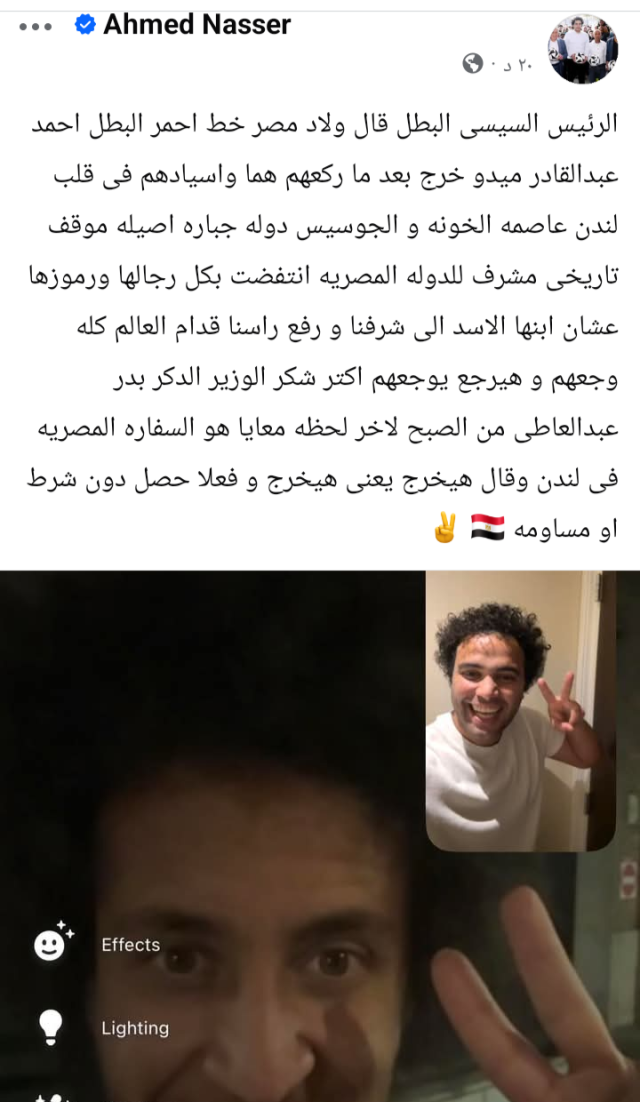 وقال ناصر عبر حسابه الرسمي على فيسبوك: "الرئيس السيسي البطل قالها صراحة: إن ولاد مصر خط أحمر، والبطل أحمد عبدالقادر (ميدو) خرج بعد أن أربك خصوم الدولة وأفشل مخططاتهم في قلب لندن، عاصمة من اعتادت احتضان الأصوات المعادية.