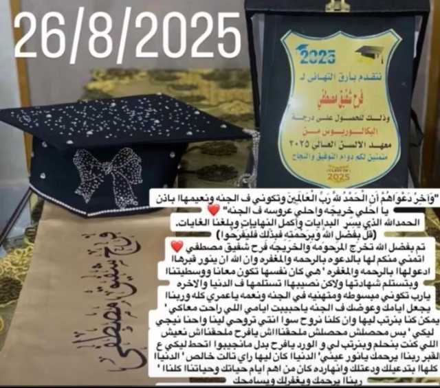 في مشهد استثنائي ومؤثر جمع ما بين الفقد والأمل، ارتدت والدة الطالبة الراحلة فرح شعبان ثوب التخرج بدلاً عن ابنتها الراحلة في حفل تخرج كلية الألسن يوم 26 أغسطس 2025.