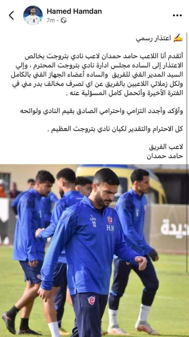 كتب حامد حمدان عبر حسابه الشخصي على فيسبوك: "أتقدم أنا اللاعب حامد حمدان لاعب نادي بتروجيت بخالص الاعتذار إلى مجلس ادارة نادي بتروجيت المحترم، وإلى المدير الفني للفريق، وأعضاء الجهاز الفني بالكامل، ولكل زملائي اللاعبين بالفريق، عن أي تصرف مخالف بدر مني في الفترة الأخيرة، وأتحمل كامل المسؤولية عنه".