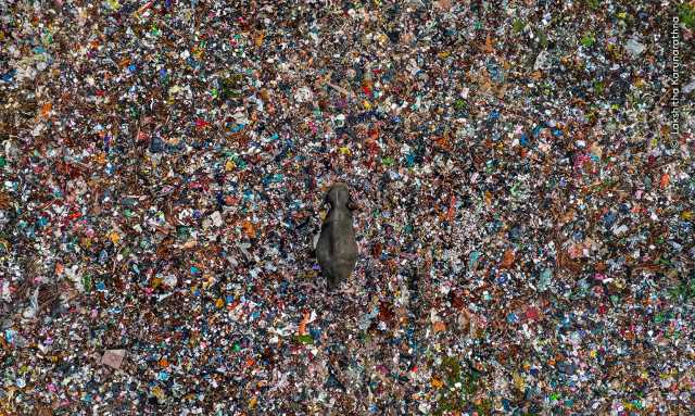 وفي لقطة ثالثة، يتجول فيل وحيد بين أكوام من القمامة متعددة الألوان في موقع للتخلص من النفايات.