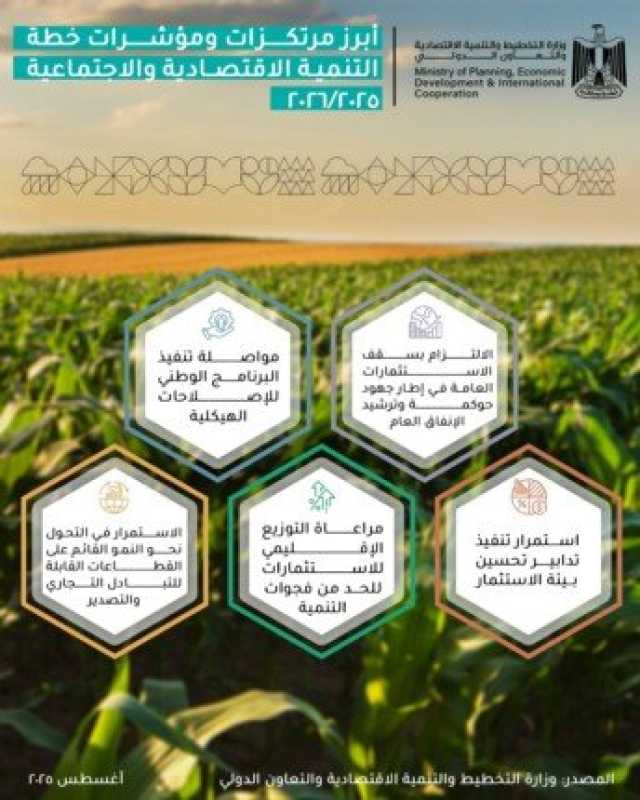 أعلنت وزارة التخطيط والتنمية الاقتصادية والتعاون الدولي، مرتكزات خطة التنمية الاقتصادية والاجتماعية للعام المالي 2025/2026، التي بدأ تنفيذها رسميًا بدءًا من يوليو الماضي، والتي تأتي في وقت تسعى فيه الدولة المصرية لمواصلة مسيرة التنمية وسط توترات واضطرابات إقليمية ودولية متتالية، تلقي بظلالها على المشهد الاقتصادي العالمي.