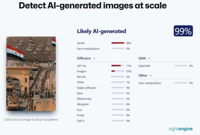 وأفادت مؤشرات أداة Sightengine بأن الصورة تميل بنسبة 99% إلى كونها زائفة، ولا تحتوي عناصر طبيعية. وحاز احتمال إنتاجها عن طريق Chat GPT- 4o على نسبة 71%.