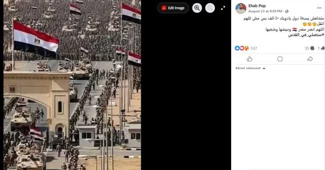 كان وصف الصورة يقول: "تحرك الجيش المصري على معبر رفح.. في هذه الصورة 40 ألف جندي مصري من أصل 920 الف جندي ما بين جندي نشط واحتياط".