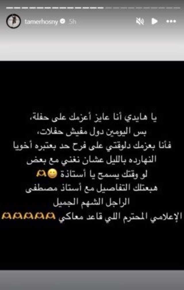 ووجه تامر حسني، عبر حسابه على «إنستجرام» دعوة لـ هايدي، قائلا: «يا هايدي أنا عايز أعزمك على حفلة، بس اليومين دول مفيش حفلات، فأنا بعزمك دلوقتي على فرح حد بعتبره أخويا النهاردة بالليل عشان نغني مع بعض، لو وقتك يسمح، هبعتلك التفاصيل مع أستاذ مصطفى، الراجل الشهم الجميل الإعلامي المحترم اللي قاعد معاكي».