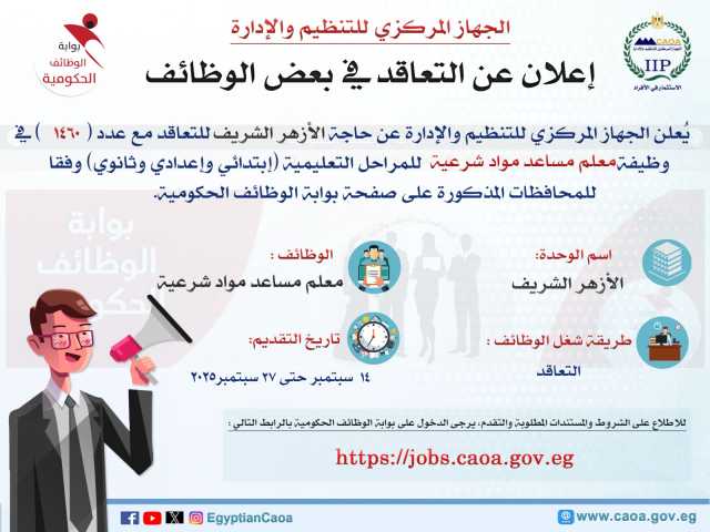 أعلن المهندس حاتم نبيل، رئيس الجهاز المركزي للتنظيم والإدارة، عن حاجة الأزهر الشريف للتعاقد مع عدد (1460) في وظيفة معلم مساعد مواد شرعية للمراحل التعليمية (ابتدائي وإعدادي وثانوي)، وفقاً للمحافظات المذكورة على صفحة بوابة الوظائف الحكومية.
