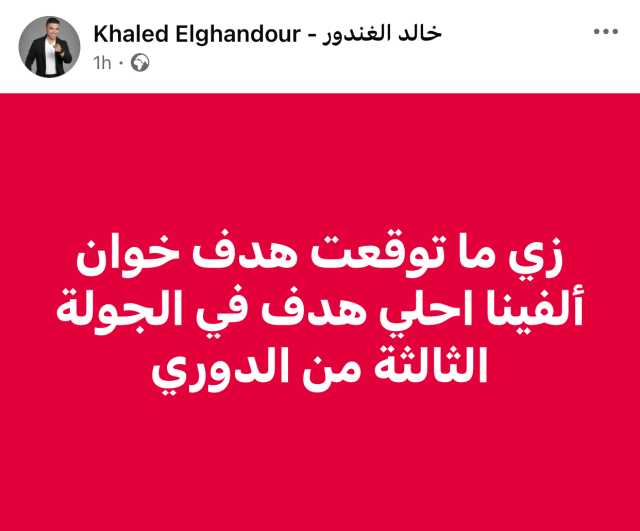 وكتب الغندور عبر حسابه الشخصي بموقع فيسبوك: “زي ما توقعت.. هدف خوان ألفينا أحلى هدف في الجولة الثالثة من الدوري”.