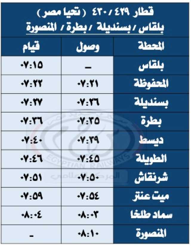 أعلنت الهيئة القومية لسكك حديد مصر عن تشغيل خدمة جديدة على خط المنصورة – بلقاس والعكس، وذلك بعربات "تحيا مصر" ، اعتباراً من يوم الإثنين الموافق 1 / 9 / 2025 تشغيل قطارات أرقام ( 432 / 433 - 429 / 430 - 436 / 437- 435 / 434 - 440 / 441 - 443 / 444 ) ما بين المنصورة وبلقاس والعكس بعربات تحيا مصر وطبقاً للجدول المرفق .