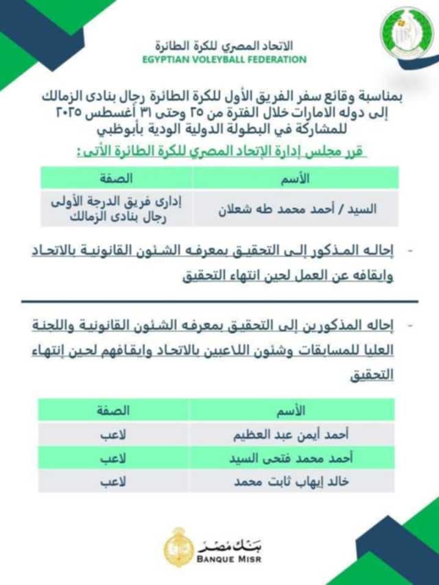 كشف مصدر مطلع داخل الاتحاد المصري للكرة الطائرة عن تطورات جديدة تخص أزمة فريق طائرة الزمالك رجال ، بعد واقعة سفر إداري الفريق أحمد شعلان وثلاثة لاعبين إلى دولة الإمارات للمشاركة في دورة ودية، دون الحصول على إذن رسمي من اتحاد اللعبة أو وزارة الشباب والرياضة بالثلاثي.