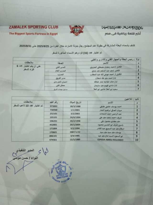 وأضاف المصدر أن القرار الوزاري الصادر بشأن سفر بعثة طائرة رجال الزمالك إلى الإمارات تضمّن قائمة بـ 10 لاعبين فقط، إلا أن الفريق سافر بـ 13 لاعبًا، من بينهم الثلاثي أحمد أيمن، وأحمد فتحي، وخالد ثابت، رغم أن أسماءهم لم تكن مُدرجة في المستند الرسمي المقدم من النادي .
