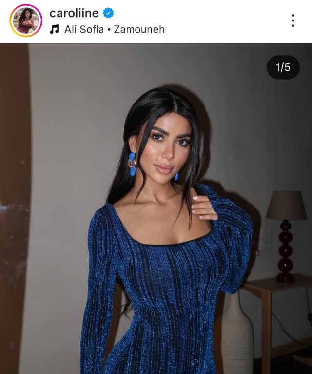 وظهرت كارولين في الصورة بإطلالة جذابة لافته مرتدية فستان مجسم باللون الأزرق الامع،مما حازت الصورة علي أعجاب متابعيها.