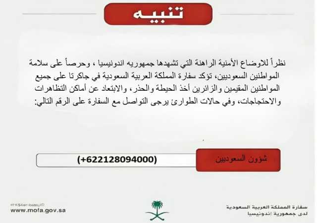 دعت السفارة السعودية في جاكرتا جميع المواطنين المقيمين والزائرين إلى توخي الحذر في ظل الأوضاع الأمنية الراهنة التي تشهدها البلاد، مؤكدة أهمية الابتعاد عن أماكن التظاهرات والاحتجاجات حفاظًا على سلامتهم.