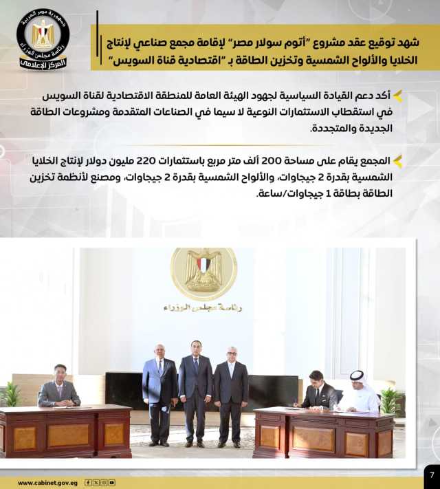 كما شهد الدكتور مصطفى مدبولي، توقيع عقد مشروع "أتوم سولار مصر" لإقامة مجمع صناعي لإنتاج الخلايا والألواح الشمسية وتخزين الطاقة بـ "اقتصادية قناة السويس"، وذلك على مساحة 200 ألف م٢، وباستثمارات 220 مليون دولار لإنتاج الخلايا الشمسية بقدرة 2 جيجاوات، والألواح الشمسية بقدرة 2 جيجاوات، ومصنع لأنظمة تخزين الطاقة بطاقة 1 جيجاوات/ساعة.