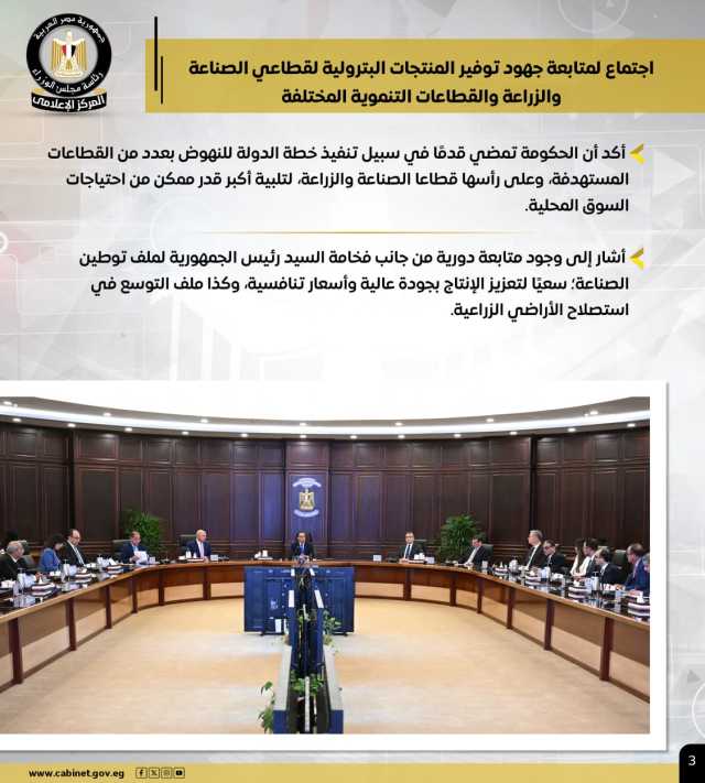 وشملت الأنشطة، اجتماع رئيس الوزراء لمتابعة جهود توفير المنتجات البترولية لقطاعي الصناعة والزراعة والقطاعات التنموية المختلفة، مشيرًا إلى وجود متابعة دورية من جانب الرئيس لملف توطين الصناعة؛ سعيًا لتعزيز الإنتاج بجودة عالية وأسعار تنافسية، وكذا ملف التوسع في استصلاح الأراضي الزراعية.