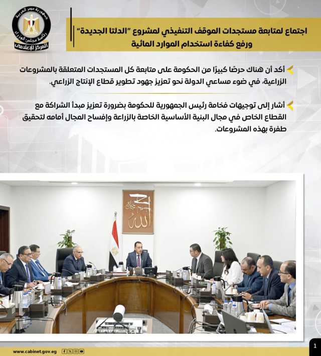 وتضمنت الأنشطة، اجتماع رئيس الوزراء، لمتابعة مستجدات الموقف التنفيذي لمشروع "الدلتا الجديدة" ورفع كفاءة استخدام الموارد المائية، حيث أشار إلى أن هناك توجيهات رئاسية بضرورة تعزيز مبدأ الشراكة مع القطاع الخاص في مجال البنية الأساسية الخاص بالزراعة، وإفساح المجال أمامه لتحقيق طفرة بهذه المشروعات.