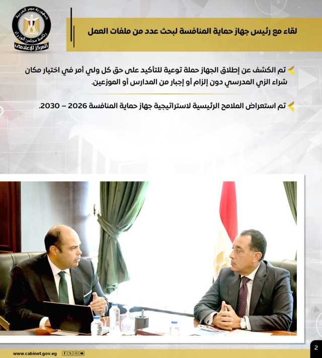 كما التقى مع رئيس جهاز حماية المنافسة، لبحث عدد من ملفات العمل، حيث تم الكشف عن إطلاق الجهاز حملة توعية للتأكيد على حق كل ولي أمر في اختيار مكان شراء الزي المدرسي دون إلزام أو إجبار من المدارس أو الموزعين، كما تم استعراض الملامح الرئيسية لاستراتيجية جهاز حماية المنافسة 2026 – 2030.