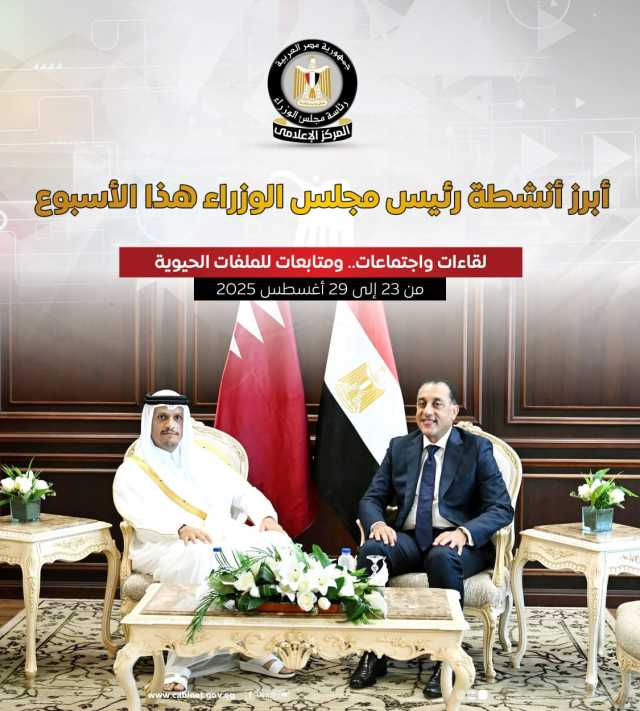نشر المركز الإعلامي لمجلس الوزراء عددًا من الإنفوجرافات عبر منصاته على مواقع التواصل الاجتماعي، استعرض خلالها أبرز أنشطة الدكتور مصطفى مدبولي، رئيس مجلس الوزراء، خلال الأسبوع الجاري من 23 إلى 29 أغسطس ٢٠٢٥، والتي شملت لقاءات واجتماعات ومتابعات للملفات الحيوية.