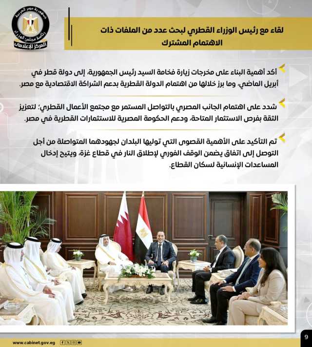 كما التقى مع رئيس الوزراء القطري، لبحث عدد من الملفات ذات الاهتمام المشترك، مؤكدًا أهمية البناء على مخرجات زيارة الرئيس إلى قطر في أبريل الماضي، وما برز خلالها من اهتمام الدولة القطرية بدعم الشراكة الاقتصادية مع مصر، فيما شدد على اهتمام الجانب المصري بالتواصل المستمر مع مجتمع الأعمال القطري، ودعم الحكومة المصرية للاستثمارات القطرية في مصر.